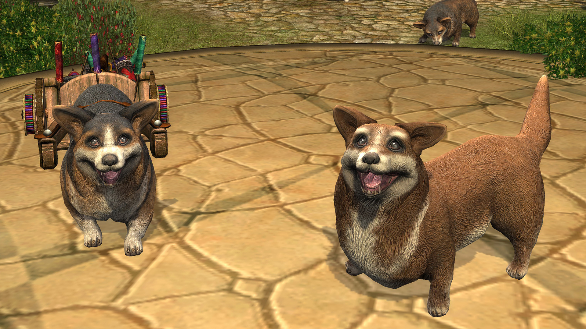 Corgis can be bartered for Festivity Tokens, Anniversary Tokens, or Mithril Coins. Some Corgis are hauling a cart while others are running unburdened. Everyone who logs in during the Anniversary Event will receive a free Corgi pet.
