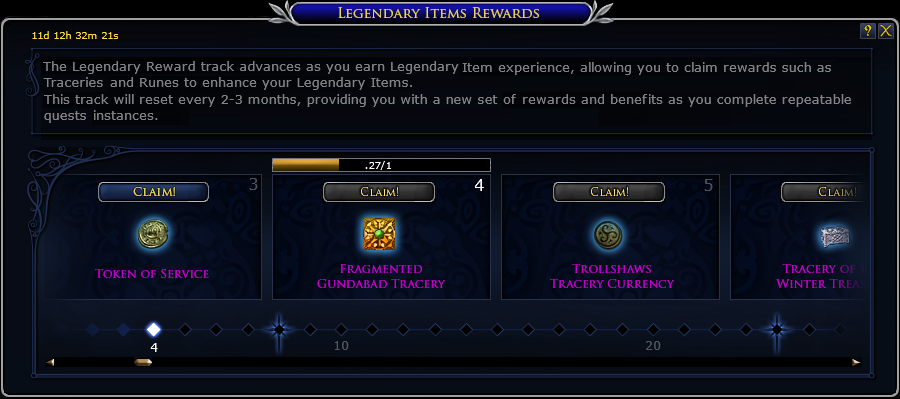 All of your characters that earn IXP will contribute to the Reward Track, and IXP is awarded in a way that players at all levels contribute equivalent progress to the track. The Legendary Items Reward Track is focused on your Legendary Items and currently includes rewards such as Enhancement Runes, Sealed Tracery boxes, Embers of Enchantment, Tracery Token boxes, Ancient Script, and more! The Legendary Items Reward Track has 101 levels, with 100 levels to achieve and then a 101st level that repeats until the following season's release.