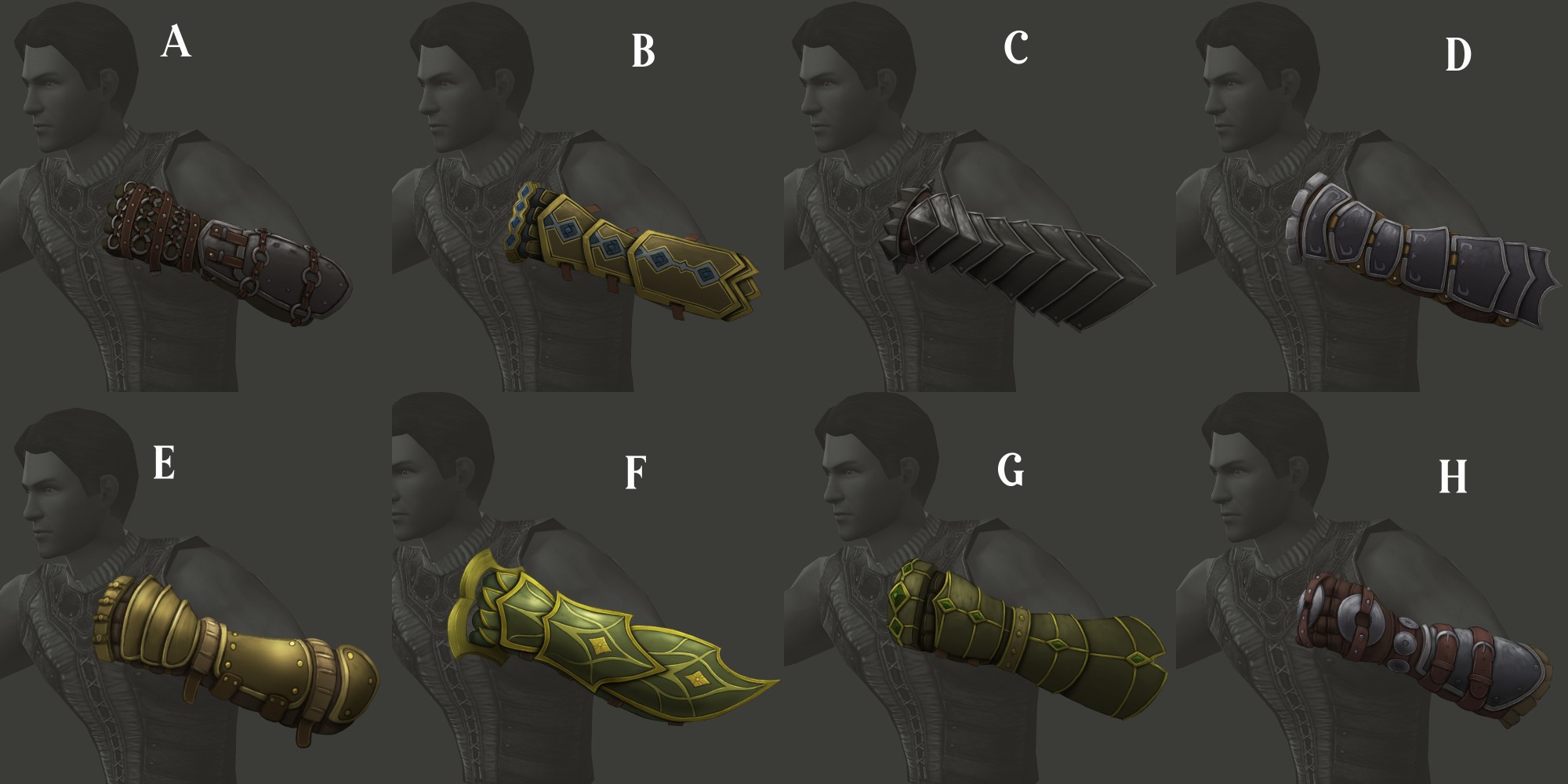 Production Artist Daniel Newman helped make sure the Battle Gauntlets looked right on the player character, and explains, “I explored all of the ways one could pummel someone with their fists. I experimented with different shapes and types of metals. A few have elf or dwarf themes woven in. I think most of these concepts ended up in the game.”