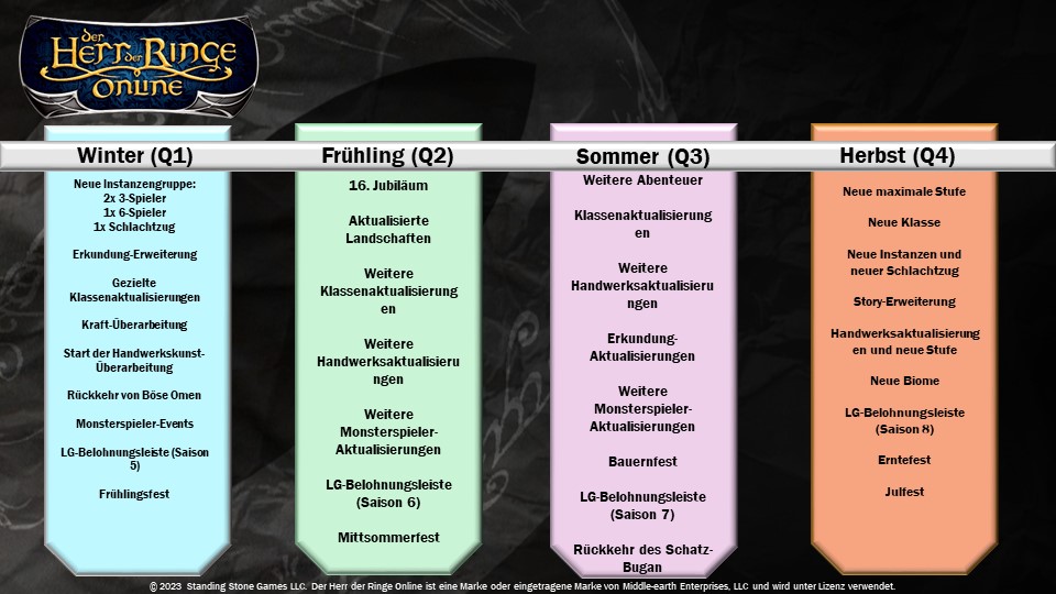 In den Frühlings- und Sommermonaten verlagert sich unser Fokus dann auf die wachsende Gefahr, die von den Gegnern in unserer nächsten großen Erweiterung ausgeht. Gondor, wo jetzt relativer Frieden herrscht, braucht Hilfe beim Wiederaufbau und bei der Untersuchung merkwürdiger Vorkommnisse. Wir führen eine neue Version von Gondor ein, nicht mehr dämmerungslos und nicht mehr auf allen Seiten von Feinden gepeinigt. Und doch gibt es noch Gefahren, denen es zu trotzen gilt. Was die Spielsysteme angeht, werden wir weiter an gezielten Klassenaktualisierungen arbeiten, das Handwerkskunst-System überarbeiten, das Monster-Spiel optimieren und die Kampfstatistiken weiter anpassen. So arbeiten wir uns langsam zu der Erweiterung vor, zu neuen Festivalbelohnungen für das Mittsommerfest und zu vielem mehr.
