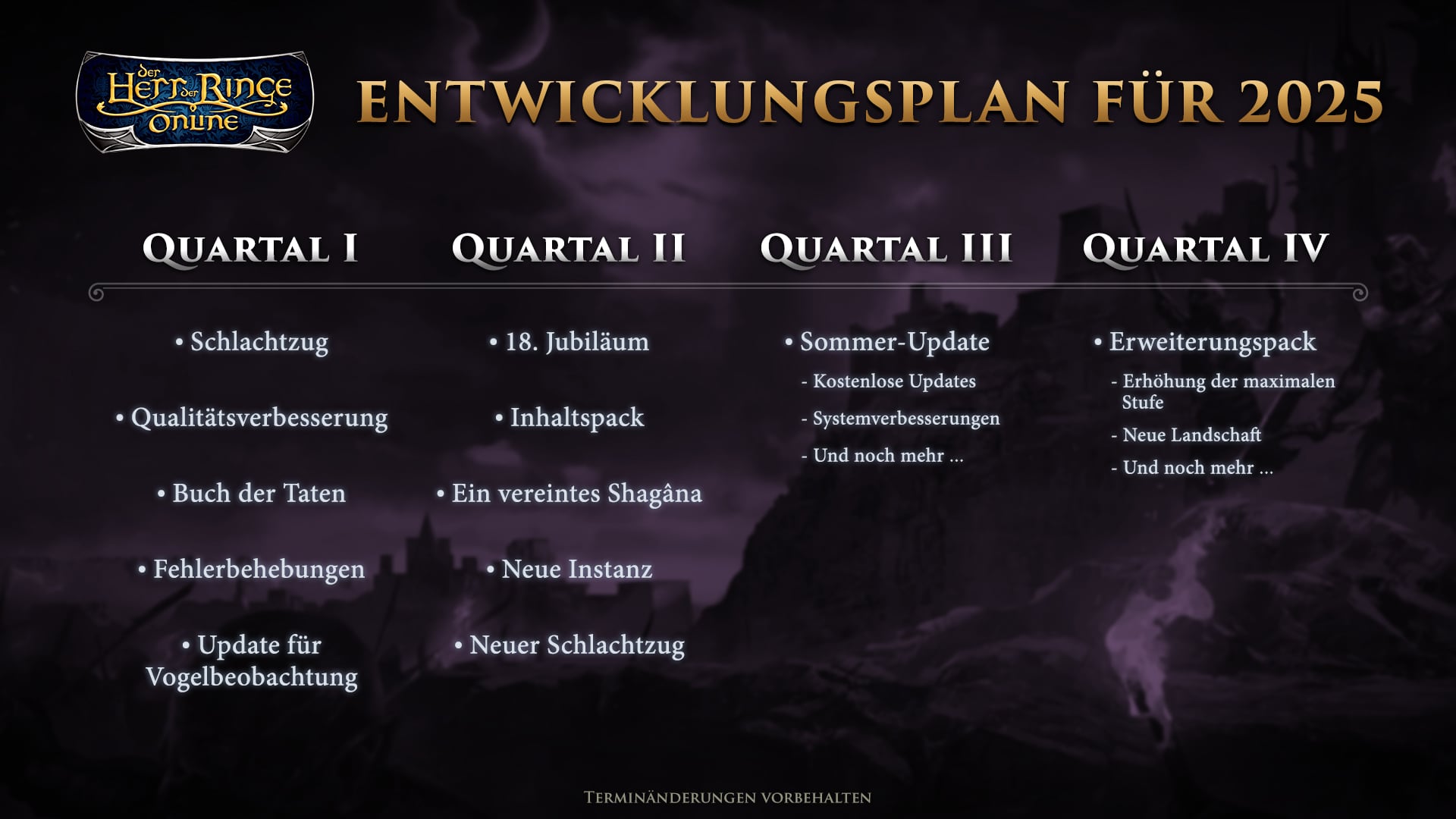 Im ersten Quartal von 2025 veröffentlichen wir für Spieler auf Stufe 150 einen Schlachtzug mit sechs Bossen in drei Trakten, ein überarbeitetes Taten-Fenster mit Modernisierung von Benutzeroberfläche und Datenmanagement, jede Menge Fehlerbehebungen, weiteres Klassen-Balancing und neue Gebiete für die Vogelbeobachtung. Wir werden auch wie gehabt an den legendären Servern und Angmar weiterarbeiten. Unser aktueller Plan sieht vor, das Update vor Ende février zu veröffentlichen.