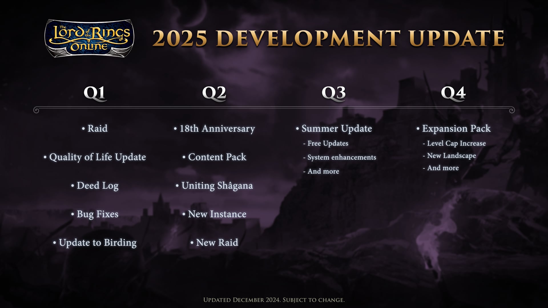 Hello and Happy Holidays from The Lord of the Rings Online team. It has been an eventful year. We released the Corsairs of Umbar instance cluster and the Mâkhda Khorbo raid, celebrated the 17th Anniversary of the game's release, opened the Catacombs of Umbar, introduced a new hobby with Birding, a fourth profession slot, added the new "Dragon" instance, updated the look of the Elves, and released the latest expansion: The Legacy of Morgoth. In addition, we released the first 64-bit servers with the Legendary Worlds of Mordor and Angmar using the special ruleset: The Veil of the Nine. We think it is fair to say 2024 was a very full year!