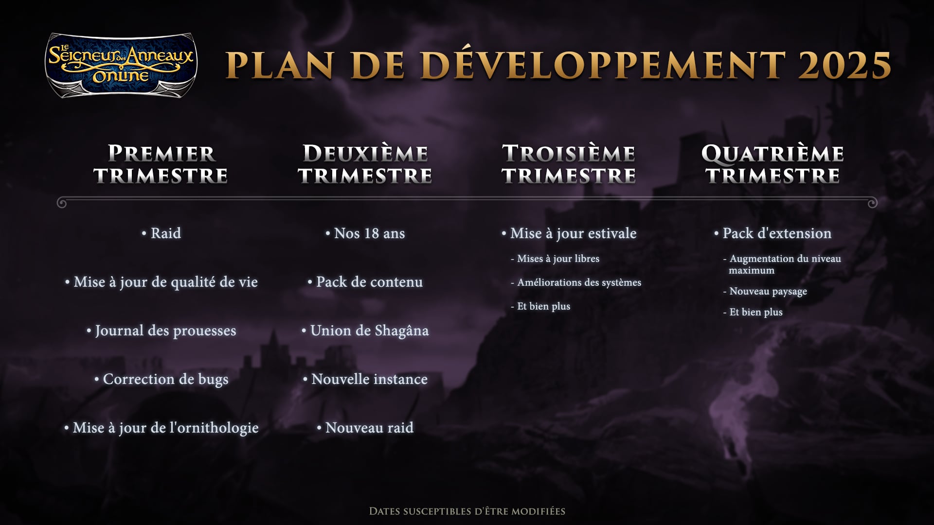 Le premier trimestre 2025 comprend un raid de six boss à trois parties pour les joueurs au niveau 150, une mise à jour du panneau des prouesses qui modernise l'interface et la gestion des données, de nombreuses corrections de bugs, de nouveaux ajustements relatifs aux classes et de nouvelles zones pour observer les oiseaux. Des modifications supplémentaires nécessaires sur les serveurs légendaires et Angmar se poursuivront également. Nous prévoyons actuellement de publier la mise à jour avant la fin du mois de février.