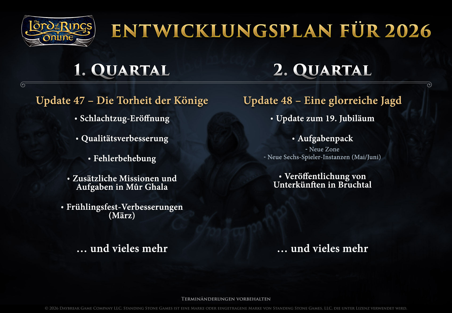 Ähnlich wie letztes Jahr haben wir vor, jedes Quartal einen Brief über den Status des Spiels und die Ziele der nächsten Updates zu veröffentlichen. Wir freuen uns auf das bevorstehende Jahr und alle Folgejahre. Wir möchten Euch an dieser Stelle von ganzem Herzen dafür danken, dass Ihr uns und unser Spiel seit so vielen Jahren unterstützt und uns die Treue haltet. Wir glauben, dass 2026 ein fantastisches Jahr für Euch und das Spiel wird. Wir freuen uns darauf, Euch auf Eurer Reise durch Mittelerde zu begleiten!