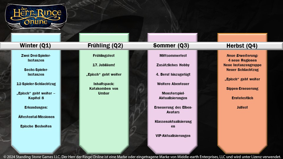 2024 soll Eure Erkundung von Mittelerde unterhaltsam weitergehen, indem wir Euch mehr Inhalte und ein zusätzliches Hobby zur Verfügung stellen.