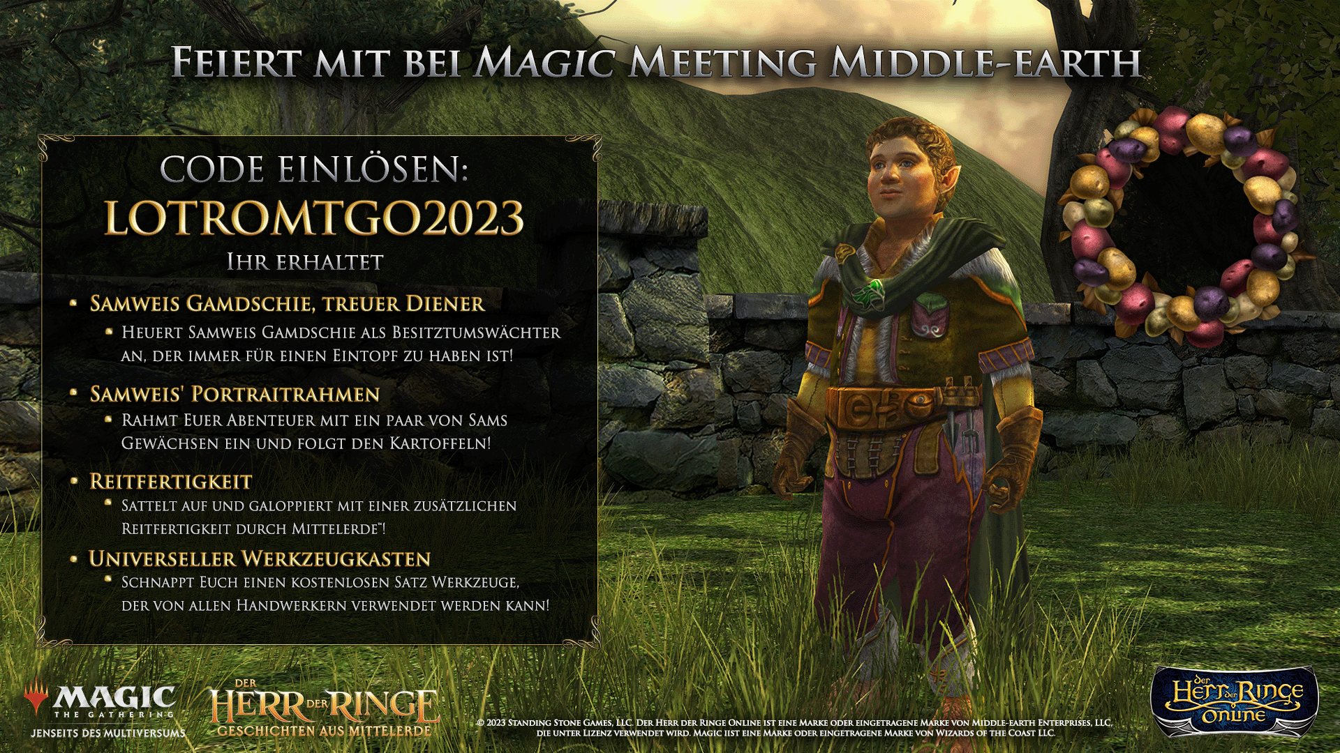 Der LOTROMTGO2023-Coupon-Code kann außerdem bei Magic the Gathering Online eingelöst werden! Bestehende Konten können mit einem besonderen Samweis Gamdschie-Avatar und entweder vier Ereignis-Tickets oder 50 Spielpunkten mitfeiern! Diese Spielpunkte können für Jumpstart-Drafts verwendet werden, und Ihr erfahrt mehr über die Jumpstart League und The Lord of the Rings: Tales of Middle-earth™ auf MTGO.com!