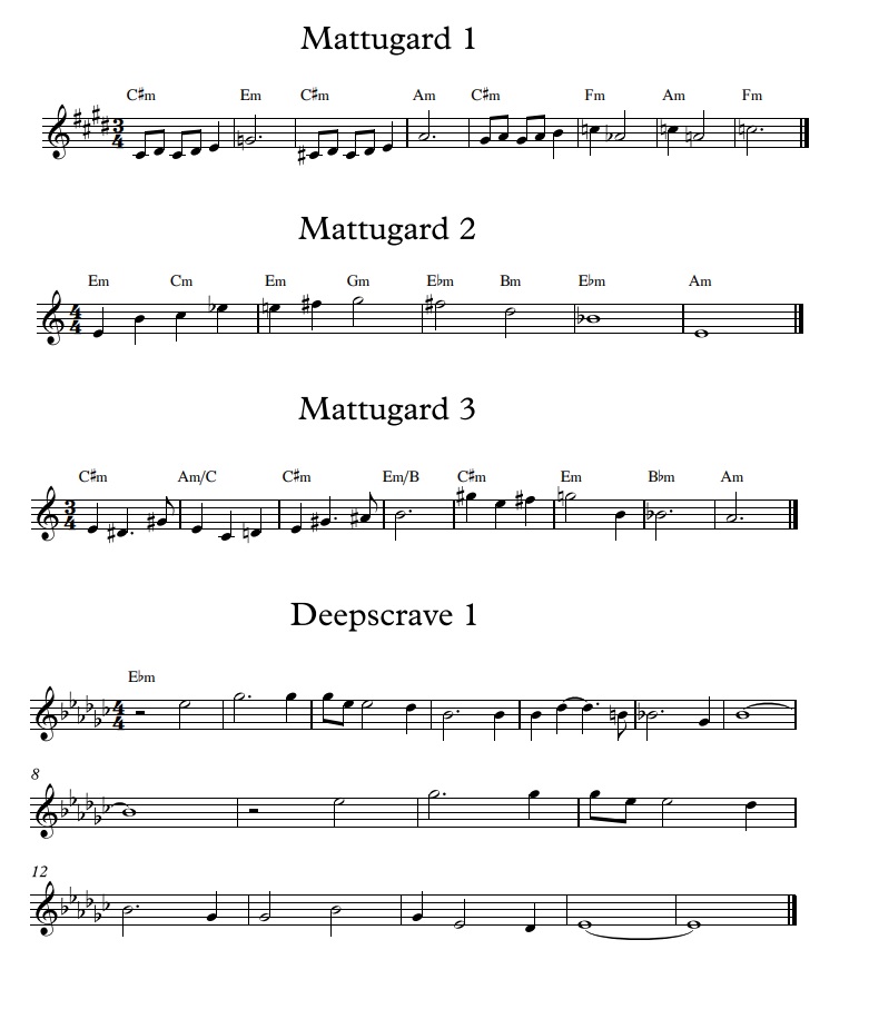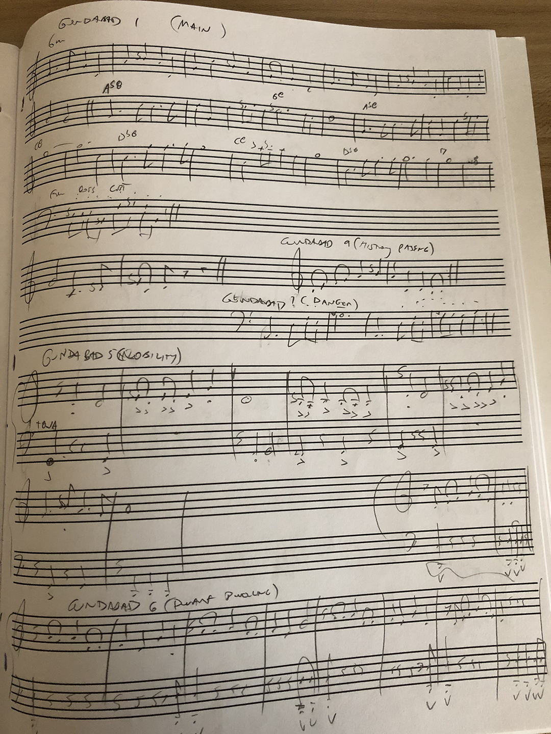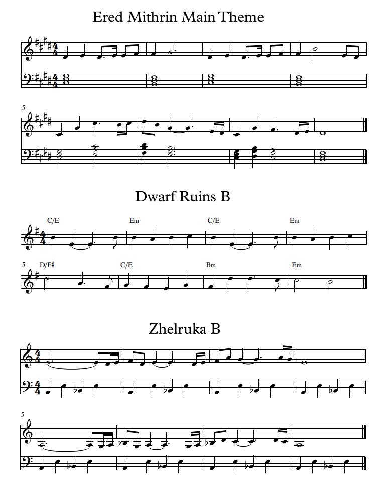 I've attached some images for reference. A few of them display my very messy handwriting as I jot down ideas; it's these kind of pages filled with thematic shorthand that I use as reference when composing each track. I've also taken the time to properly notate all 47 of the primary motifs that are used in the Gundabad soundtrack. I encourage you to look at these while you listen to the music so you can see how they're used, especially during the Legacy of Durin story instance tracks where the music is tightly tied to the drama. Each track is very deeply thought out and I hope that this gives you a sense of that effort.