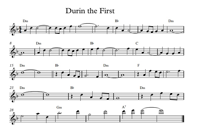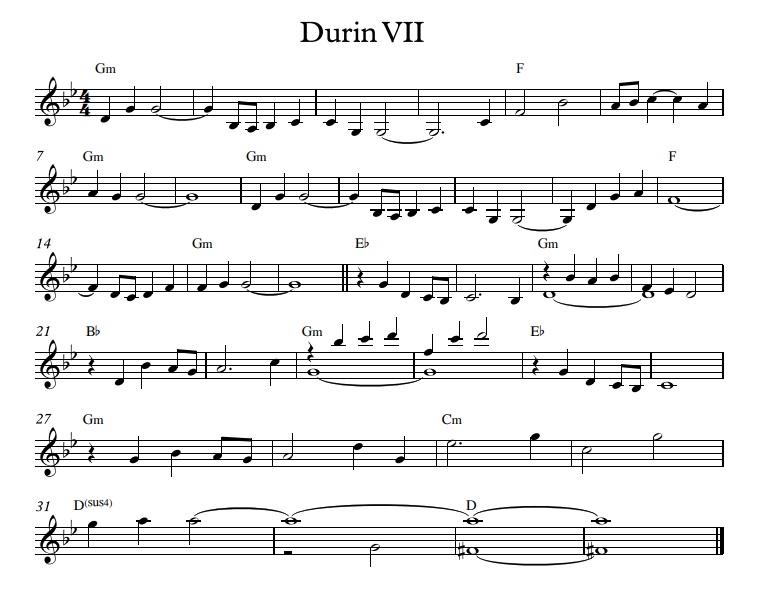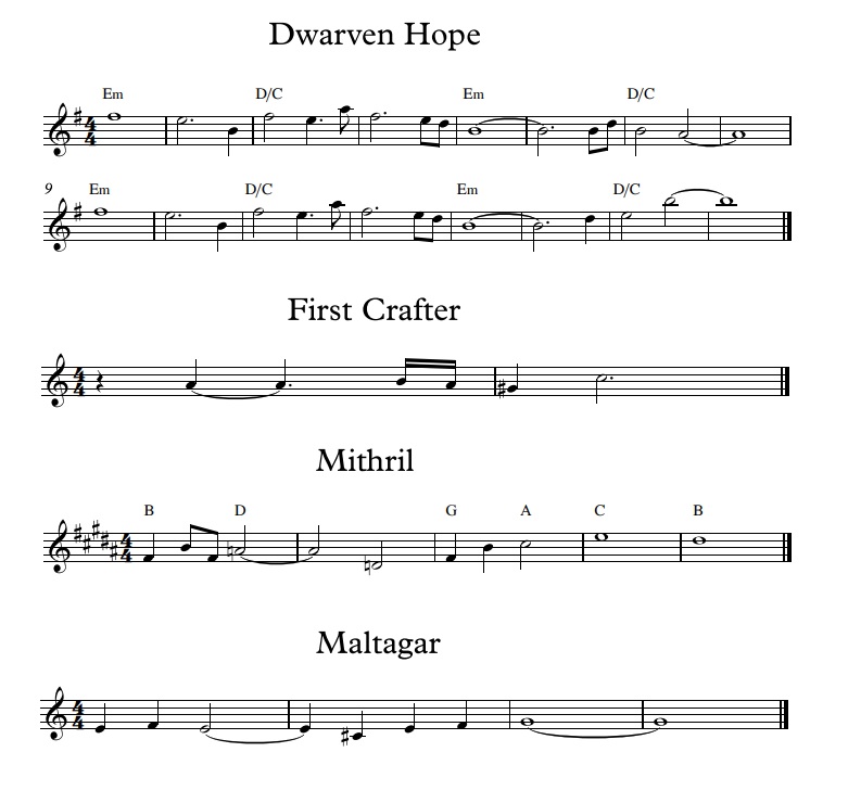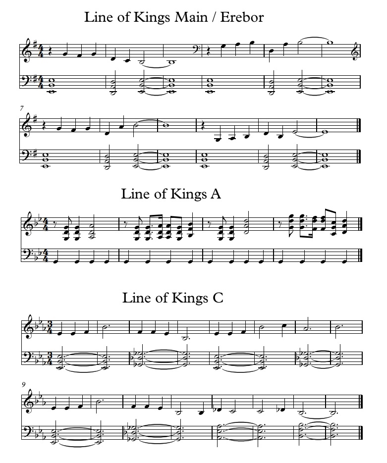 Back then I was tasked with creating themes for various dwarven ideas and places: the grandeur of the Grey Mountains, the glory of great lines of dwarf kings, the mystery and long forgotten majesty of dwarven ruins, the hope of finding Thafar-gathol, the plight of the Zhelruka and their search for a new home and, among other things, one very prominent dragon. The result was one overarching theme of hope, three ruin themes, another three for the Grey Mountains, three for the Iron Hills, two for the Zhelruka, three dragon themes, and four Line of Kings themes. At the time I was told to write the Line of King themes with Gundabad in mind.