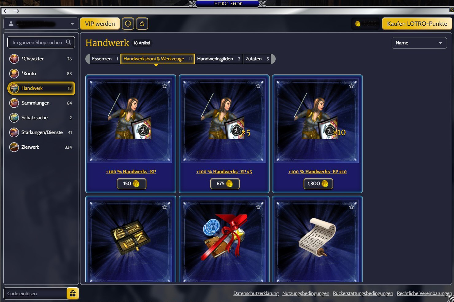 Im HdRO-Shop findet Ihr immer die neuesten Angebote und Coupons und könnt das Spiel abonnieren! Um auf den HdRO-Shop zuzugreifen, drückt im Spiel Strg+S oder klickt im Hauptmenü auf das Shop-Symbol. Im Charakterauswahl-Bildschirm könnt Ihr auf sämtliche Shop-Gegenstände Eures Kontos zugreifen, indem Ihr in der unteren/oberen rechten Bildschirmecke auf „Kontoerweiterungen kaufen“/„Punkte & Kontoerweiterungen kaufen“ klickt.